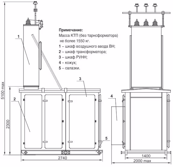 Габаритные размеры и масса КТПТАС мощностью 630 кВА