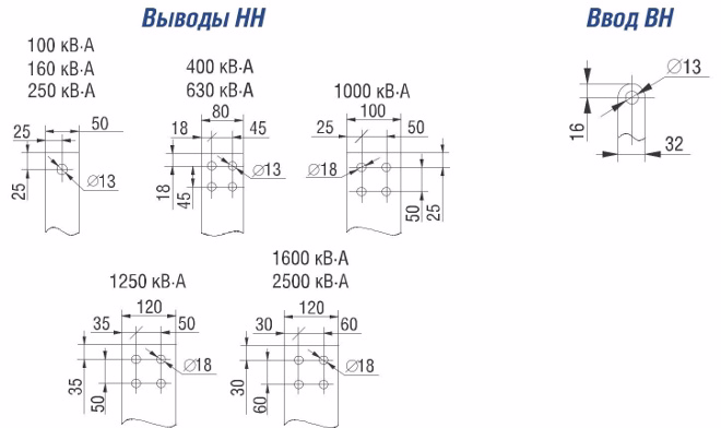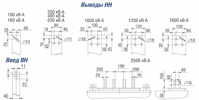 Номинальные напряжения: ВН -6; 6,3; 10; 10,5 кВ, НН - 0,4 кВ; схема и группа соединения обмоток - Д/Ун-1 1, У/Ун-0